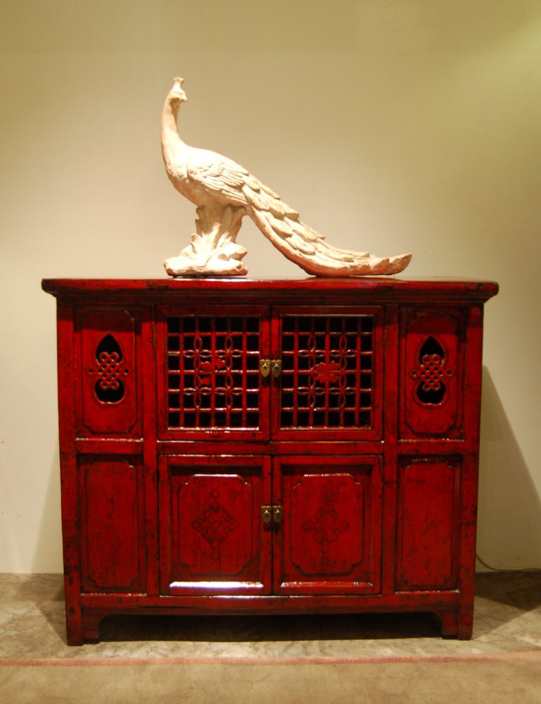 A gorgeous kitchen cabinet with lattice carved doors restored in red from Shandong. Pieces from this region north of Beijing are usually more robust to withstand the harsh climate. They also usually tend to be plain in comparison with pieces from other regions which usually have ornate decorative designs and are often covered in natural tree lacquer.