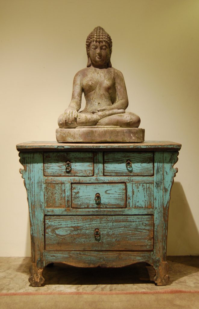 A rustic side cabinet with offset drawers re-painted in a matt blue finish from Gansu, a perfect blend of contemporary chic with old world charm. Most modern day side cabinets such as this are converted grain chests that originated from the eastern side of Gansu.