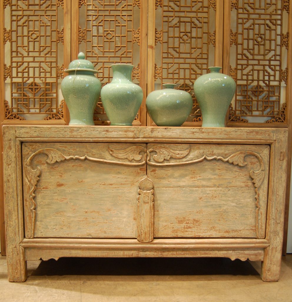 A non-typical example from the western region of Gansu – this piece is an elaborate side cabinet featuring intricate carvings and decorations restored in a natural waxed finish from Gansu.