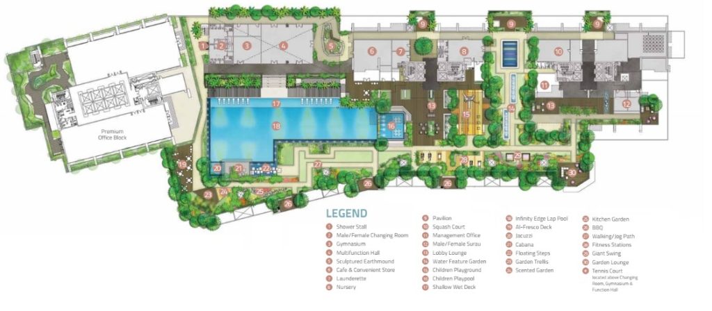 There’s a 50-metre Olympic-length swimming pool, a gym and clubhouse with exercise equipment, Jacuzzi, a tennis court, and even a 350m jogging path.