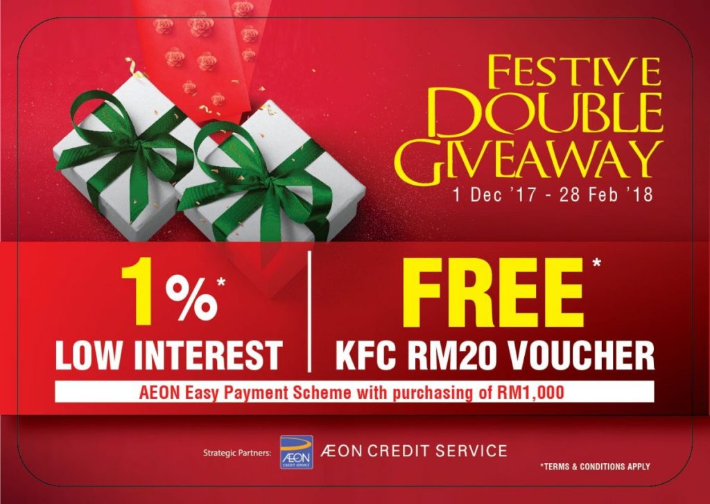 With the AEON EP scheme , you will receive 1%* low interest on the items you purchase with a minimum spend of RM1,000 and above, as well as a RM20 KFC voucher for free! If you are Maybank Cards holder, you can also stand a chance to win an iPhone X! There are 10 units to be won with purchases RM1,000 and higher.