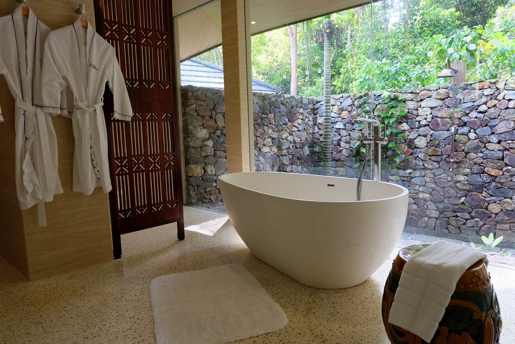 Once in the villa, we were able to just relax and enjoy. A living room cum salon fronts the generously sized private pool and sundeck outside, and from the salon, four steps up takes you to the bedroom. Comfortably appointed with all the expected amenities, the bedroom also provides direct access to the outdoor space, as well. But perhaps the best part of the villa is the spa-like bathroom. Outrageously spacious and beautifully designed, the bathroom is a masterful blend of colour, form, and materials – we loved the smooth terrazzo flooring combined with a glass wall that spilled natural light into the space from the private “backyard” garden (complete with a lovely outdoor shower, too). Amenities provided are from Malaysian company Tanamera, whose products are natural and eco-friendly.