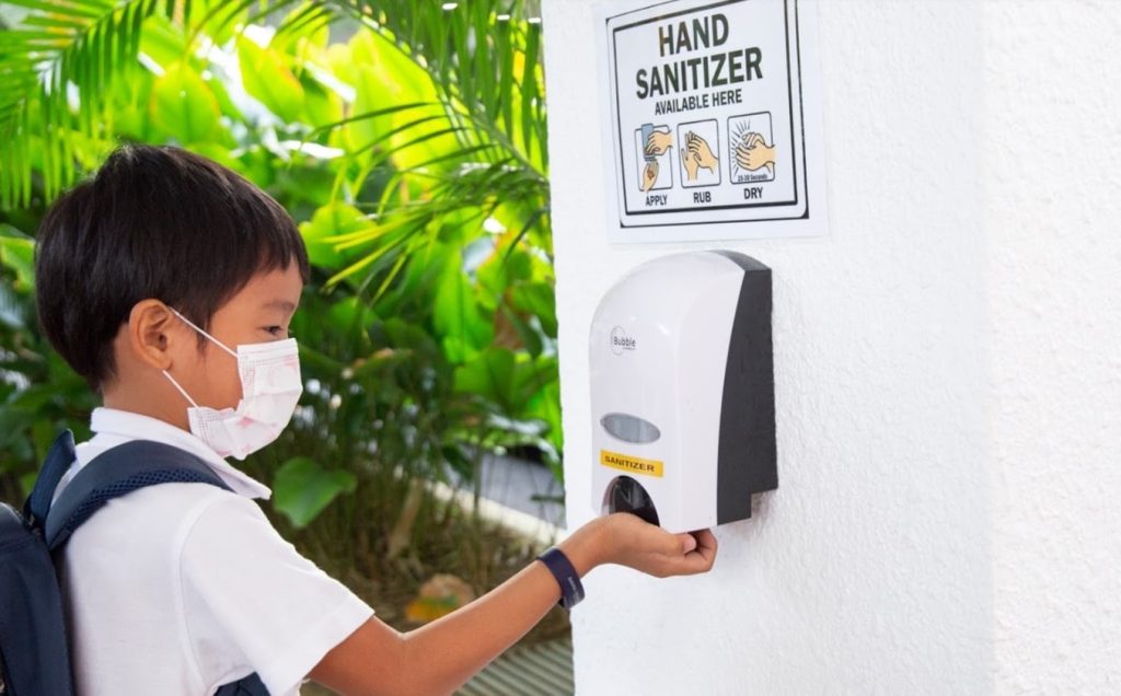 - Hand sanitizer stations available throughout the campus