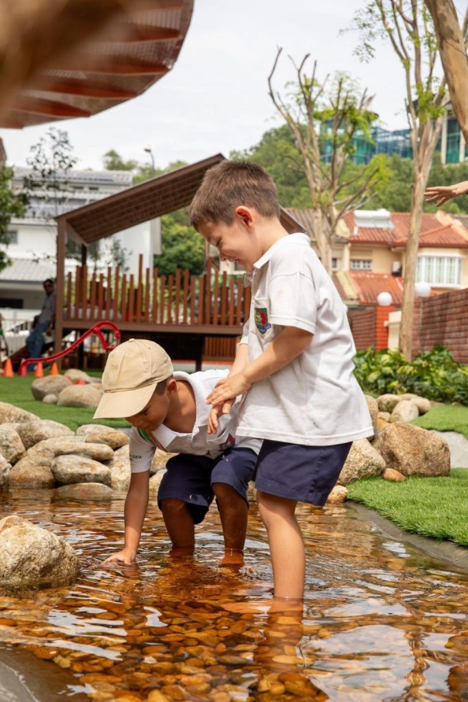 The new outdoor classroom at the EYC has been meticulously crafted to integrate the school’s lush surroundings into this unique learning environment. Within the space, students will find natural features like a shallow stream with a gentle waterfall. A small wooden bridge arches over the stream while a kampung-inspired wooden house – complete with a climbing wall and climbing net – gives young learners the chance to develop their gross motor skills while igniting their imaginations. There’s also a sandpit where children can engage in tactile play. Most importantly, these features afford children the opportunity to naturally and creatively explore the space.