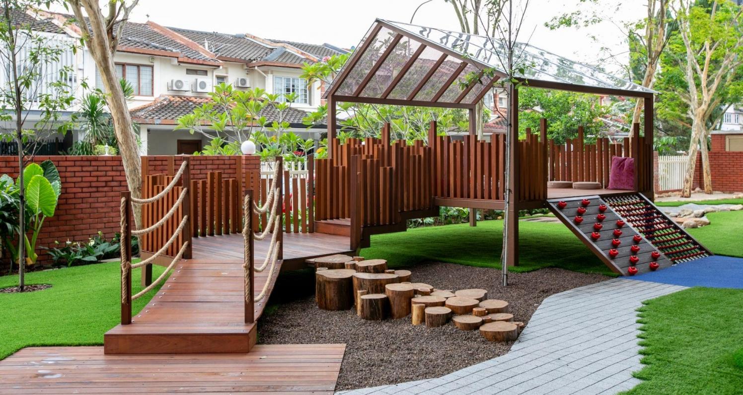The new outdoor classroom at the EYC has been meticulously crafted to integrate the school’s lush surroundings into this unique learning environment. Within the space, students will find natural features like a shallow stream with a gentle waterfall. A small wooden bridge arches over the stream while a kampung-inspired wooden house – complete with a climbing wall and climbing net – gives young learners the chance to develop their gross motor skills while igniting their imaginations. There’s also a sandpit where children can engage in tactile play. Most importantly, these features afford children the opportunity to naturally and creatively explore the space.