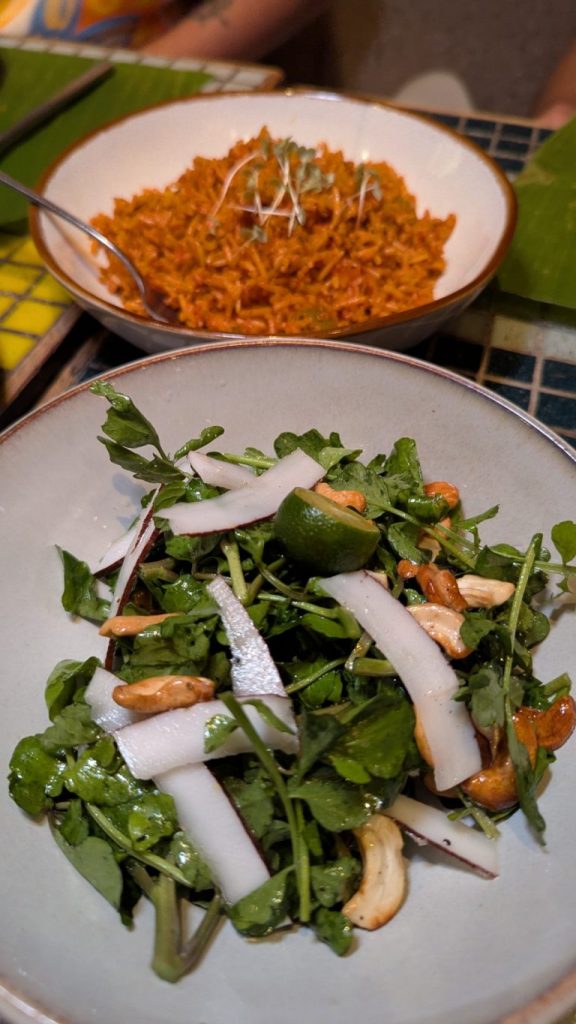 The restaurant’s exterior alone hints at what’s inside: colourful murals, a bold and funky façade, and a courtyard lit with tropical vibes. But step through the door and things shift into a sharper gear — tribal masks on textured walls, vintage reggae posters, hand-painted tiles, and a playlist that bounces from Afrobeat to Latin funk. JOLOKO may be many things, but forgettable isn’t one of them. We were smitten right from the start, and we hadn’t even placed our orders!
