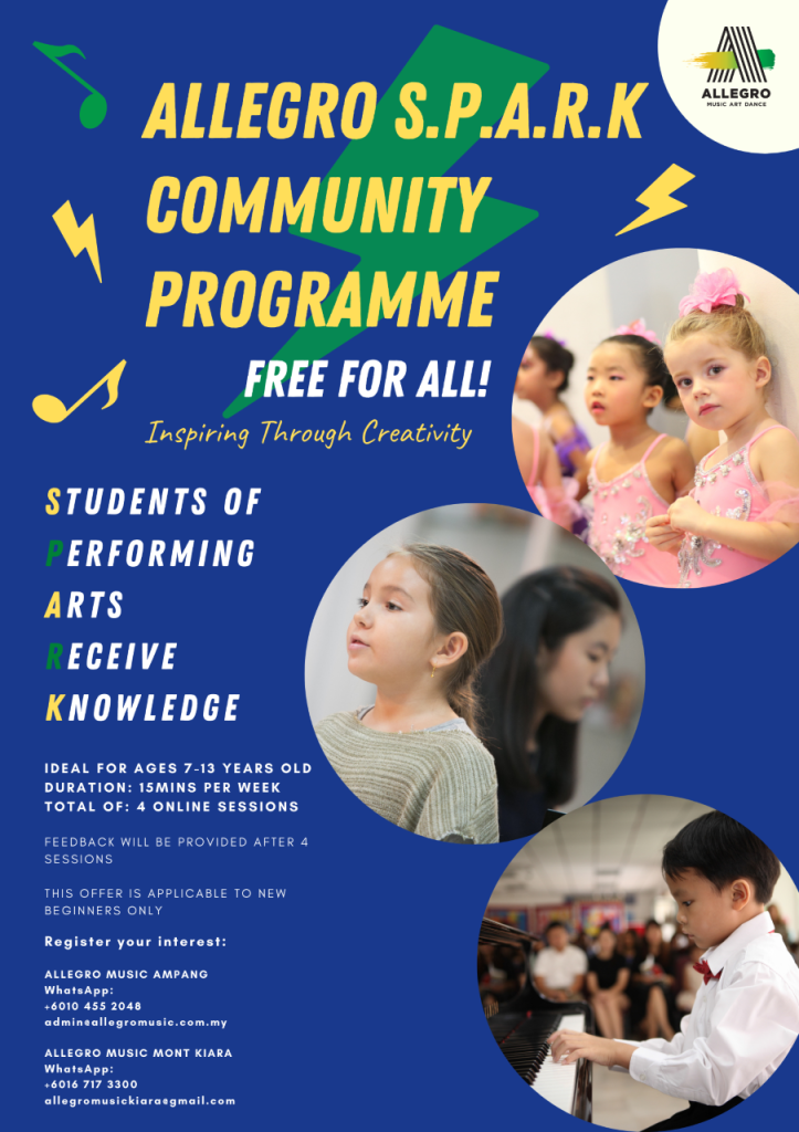Recognising that it is particularly challenging for parents and children during this time, it is with the hopes that if your child needs a creative outlet, this programme is for you. Allegro offers taster sessions for piano/keyboard, ukulele/guitar, singing and dance, to instil a SPARK of inspiration to your week. This programme is FREE for a duration of 4 weeks, details below in the poster.